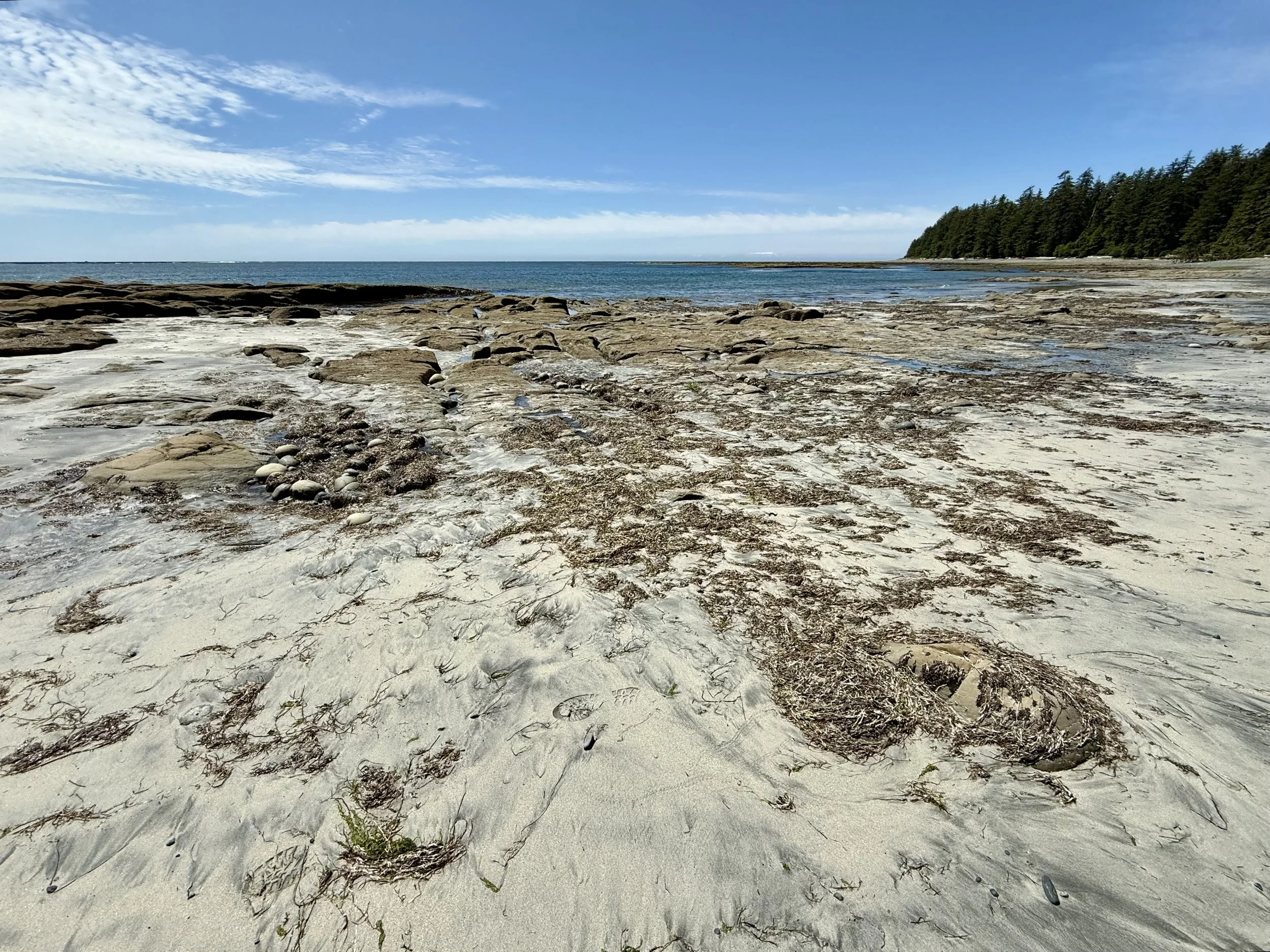 There is a trail map published by John Baldwin that we purchased at our Air Nootka flight. It’s perfect and shows exactly what you need. I’m sure some folks will try to find online something to avoid buying it, but we recommend just to get it and support the work of the folks who make this trail happen. We climbed up the rock and into the forest, and then emerged on more beach. From here, we followed the tidal shelf at low tide, and walked what felt like endless beaches, and barely saw another soul the entire time. We were so enamoured with the expansive landscape, we barely notice the sun and wind burn on my legs that was developing from the sun reflecting off the ocean. More on that later. We took our time, making photos and videos and scanning the ocean for sea creatures. Our Garmin recorded 13.58km over 5h50m and a total ascent of 158m, including all breaks and non moving time. We absolutely could have gone faster but had no desire to.